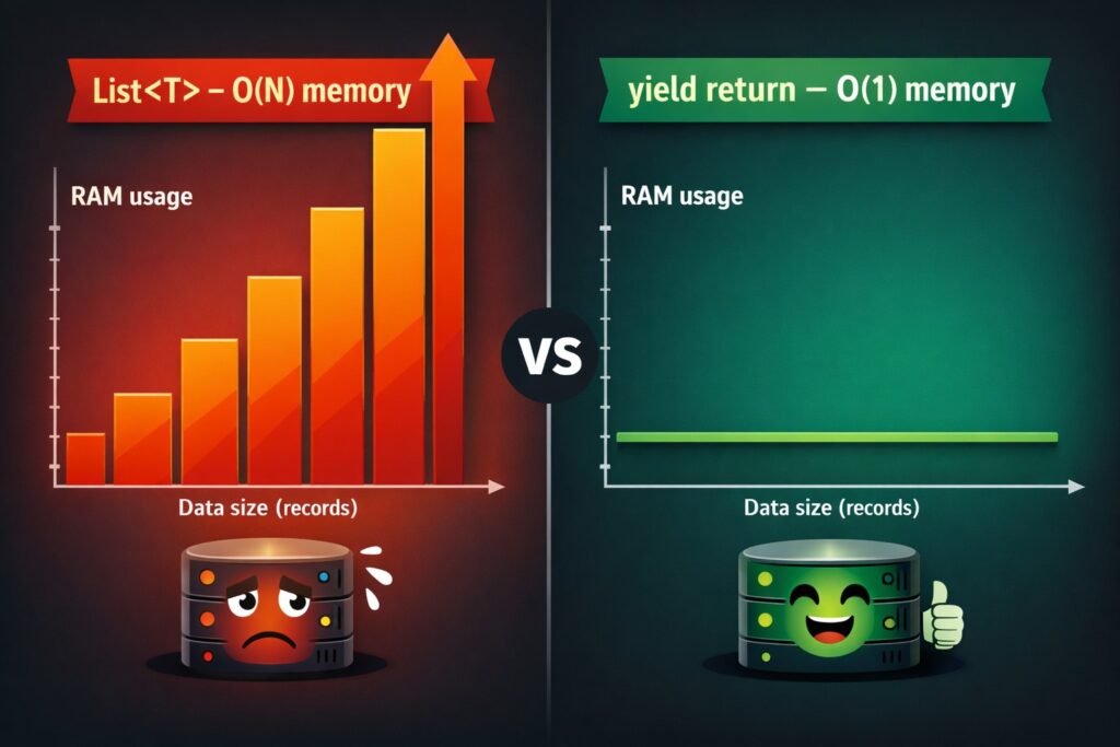 - ✅ Złożoność pamięciowa spada z O(N) do O(1) – dla dużych zbiorów danych (pliki, bazy danych) to różnica między stabilnym serwisem a OutOfMemoryException o 3:00 w nocy.