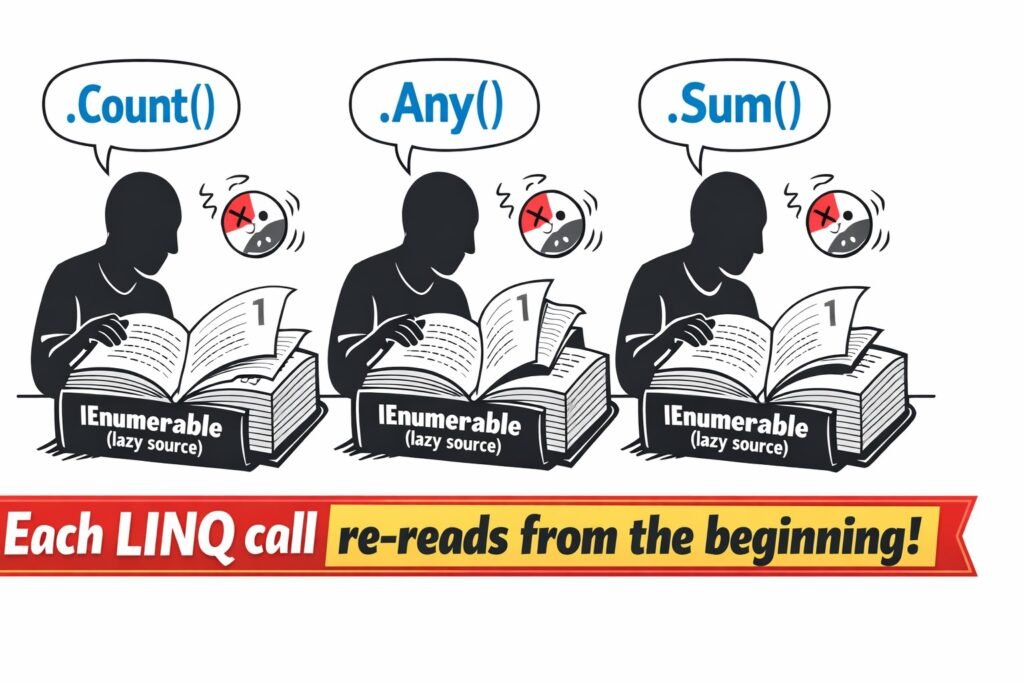 Leniwe przetwarzanie ma jeden poważny efekt uboczny, o którym wielu juniorów (i nie tylko) zapomina. IEnumerable to obietnica, nie pudełko z danymi.