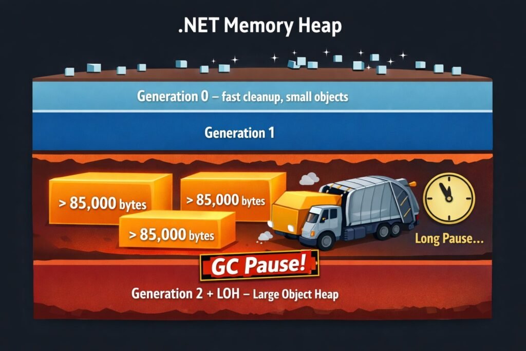 W .NET obowiązuje twarda reguła: obiekty o rozmiarze ≥ 85 000 bajtów trafiają nie na normalną stertę, lecz na Large Object Heap (LOH). To ma dwie poważne konsekwencje: