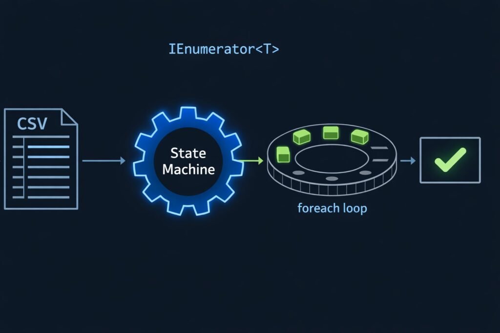 W tym artykule zobaczysz, jak IEnumerable<T> i słowo kluczowe yield return pozwalają przetworzyć gigabajty danych, trzymając w pamięci RAM zaledwie jeden rekord na raz. Zrozumiesz, jak kompilator C# buduje pod spodem maszynę stanów, poznasz pułapkę Multiple Enumeration i dowiesz się, kiedy leniwe przetwarzanie może zrujnować Twoją wydajność I/O. Gotowy? Zaczynamy.