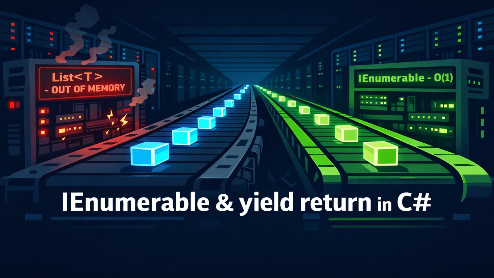 W tym artykule zobaczysz, jak IEnumerable<T> i słowo kluczowe yield return pozwalają przetworzyć gigabajty danych, trzymając w pamięci RAM zaledwie jeden rekord na raz. Zrozumiesz, jak kompilator C# buduje pod spodem maszynę stanów, poznasz pułapkę Multiple Enumeration i dowiesz się, kiedy leniwe przetwarzanie może zrujnować Twoją wydajność I/O. Gotowy? Zaczynamy.