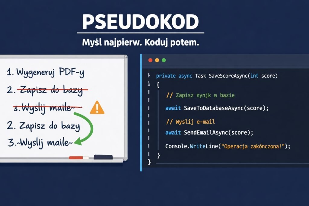 To najczęstszy błąd myślowy: ‘Pseudokod? To chyba dla początkujących.’ Nieprawda. I to rażąca nieprawda.