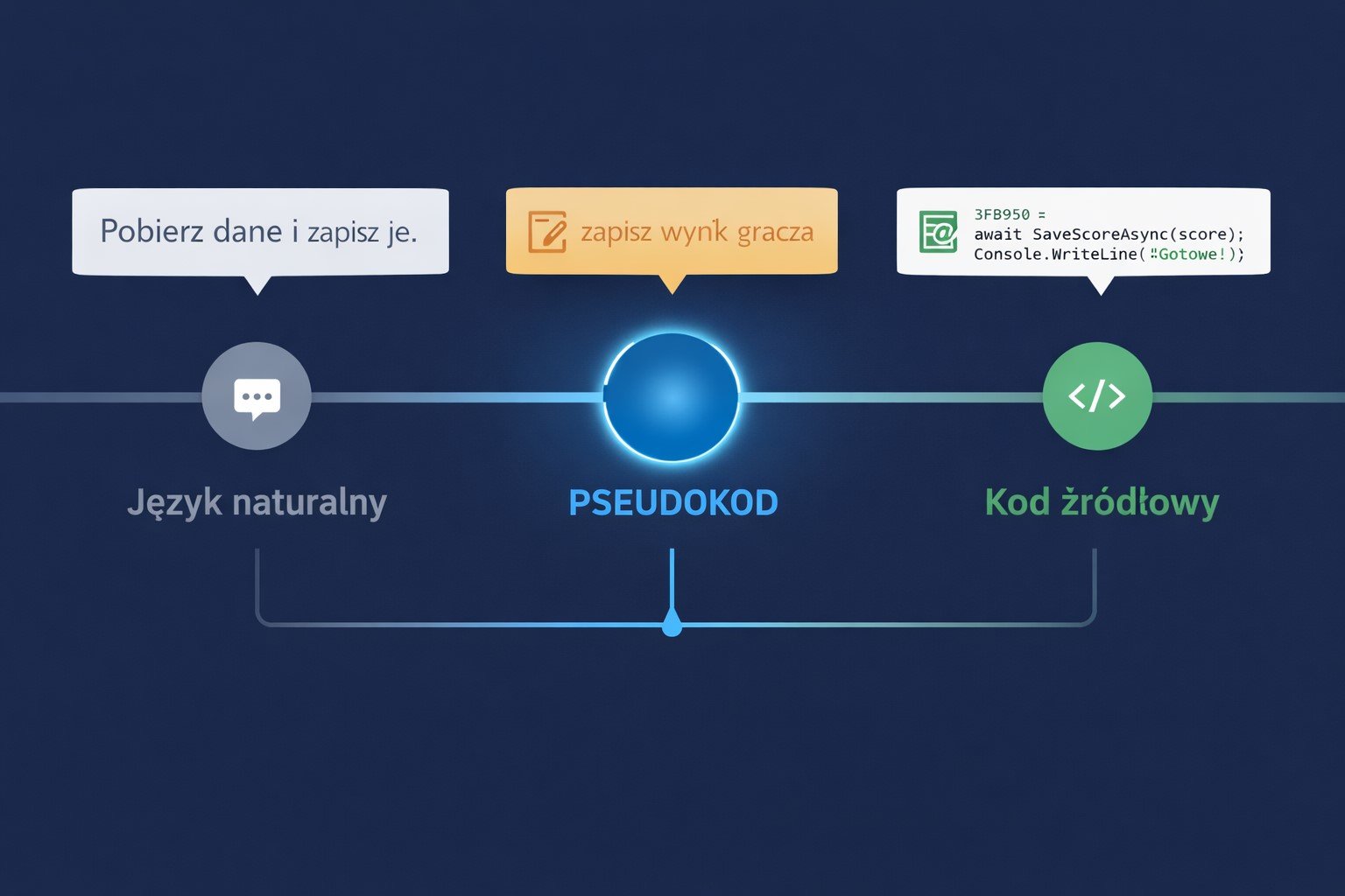 Pseudokod to opis logiki programu zapisany w języku naturalnym, który jest na tyle konkretny, żeby można go było przełożyć na kod — ale na tyle luźny, żeby nie rozpraszały Cię zasady składni.