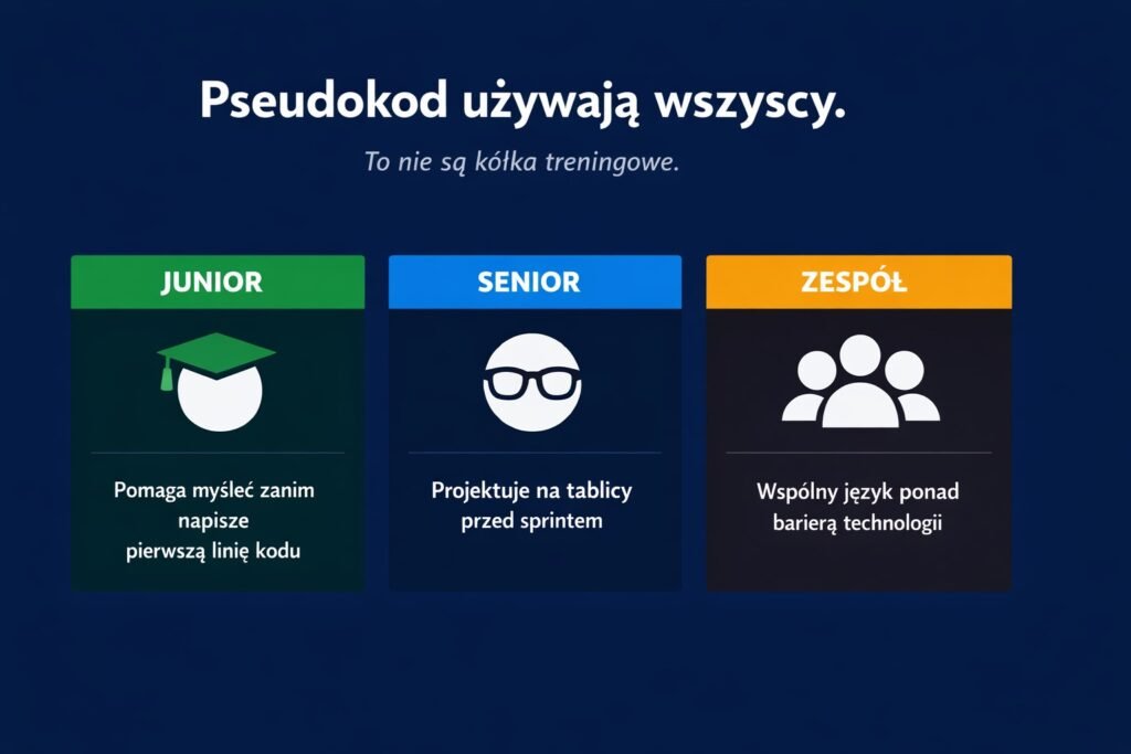 Pseudokod to wspólny język ponad barierą technologii. Junior i senior, frontend i backend, programista i product owner — wszyscy mogą rozmawiać o logice, zanim ktokolwiek napisze linię kodu.