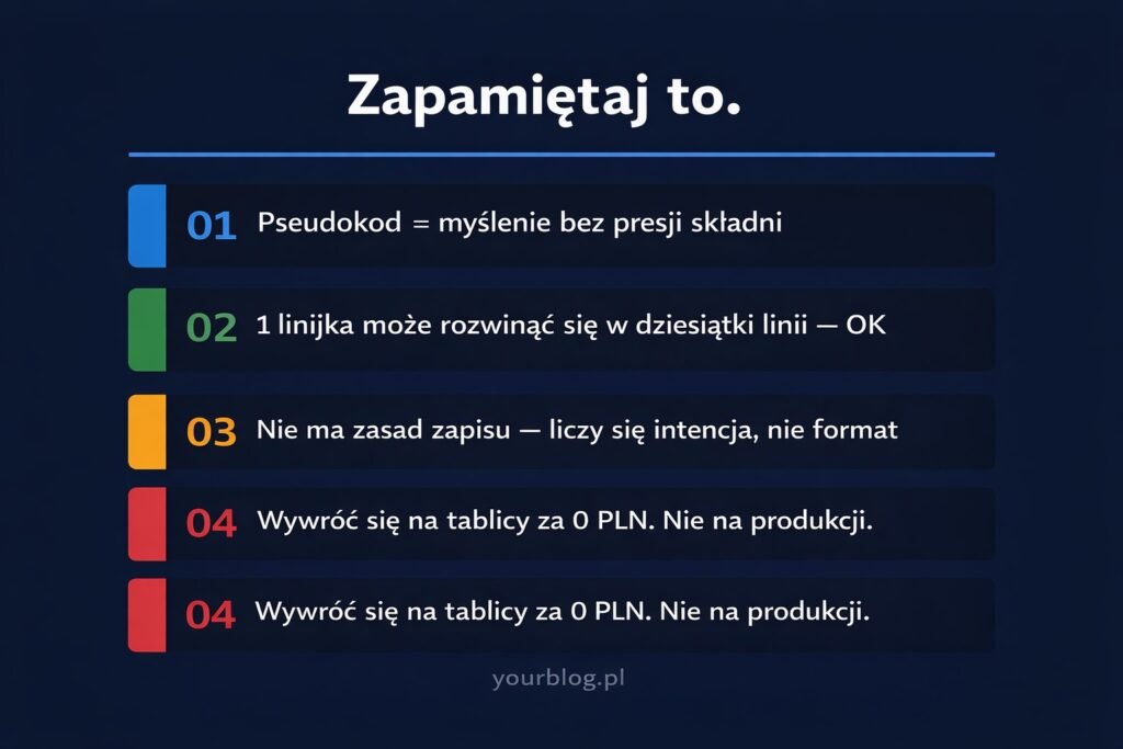 ✅ Jak powinno być: Potraktuj pseudokod jako mapę — mówi, dokąd idziesz, nie jak wygląda każdy kamień na drodze.